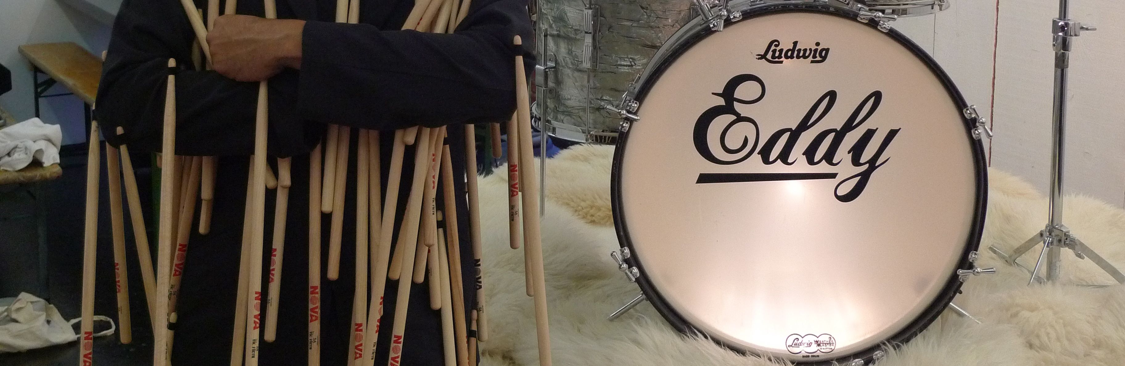 « Plus qu’un personnage, Eddy est un alter ego du batteur/performeur Stéphane Vecchione. Entre super-héros encombré par sa différence, humain réduit à son animalité par son incapacité de parler le langage normatif de ses pairs, Eddy est systématiquement seul. Suivant les performances et les différentes logiques anticonformistes selon lesquelles il manipule son instrument – une batterie des plus classiques dont l’histoire est fortement liée à l’imaginaire rock, pratique naguère instinctive désormais enseignée rigoureusement dans les écoles de musique – on devine ses espoirs, sa colère, ses craintes face à l’étroitesse des possibilités du monde contemporain. Son comportement rebelle et poétique, ses constructions sonores tantôt cathédrales, tantôt déchirures, tantôt grooves dangereux, tantôt vacuums vertigineux, disent quelque chose de nous touxtes mais surtout disent beaucoup, sans mots, sans explications, des énergies que son auteur cache derrière son masque.» Patrick de Rham